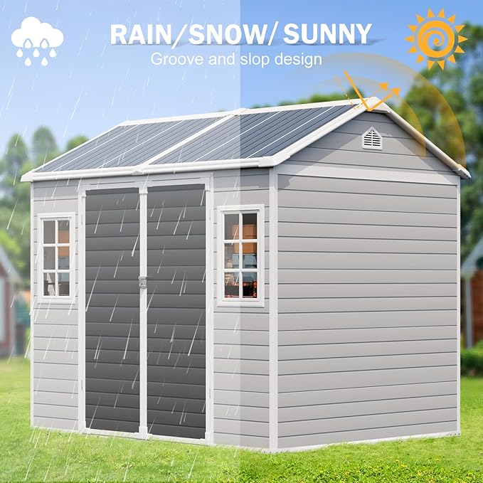 - 【Premium and Durable Material】The 14mm tough double-wall resin construction, 0.6 mm galvanized steel frame and impact-resistant floor are designed for long-term durability. The double-wall panels are waterproof and moisture-proof, allowing worry-free use in all weather conditions. It is weather-resistant, waterproof, and UV-resistant-no peeling, rotting, or rusting. The screws are embedded to ensure aesthetics and safety