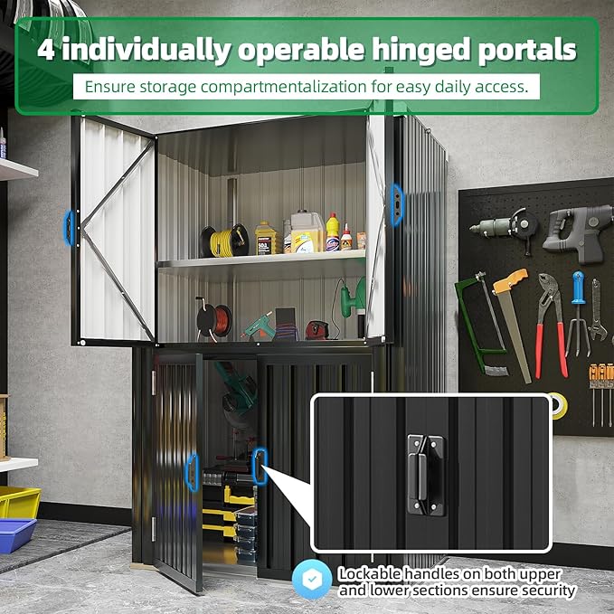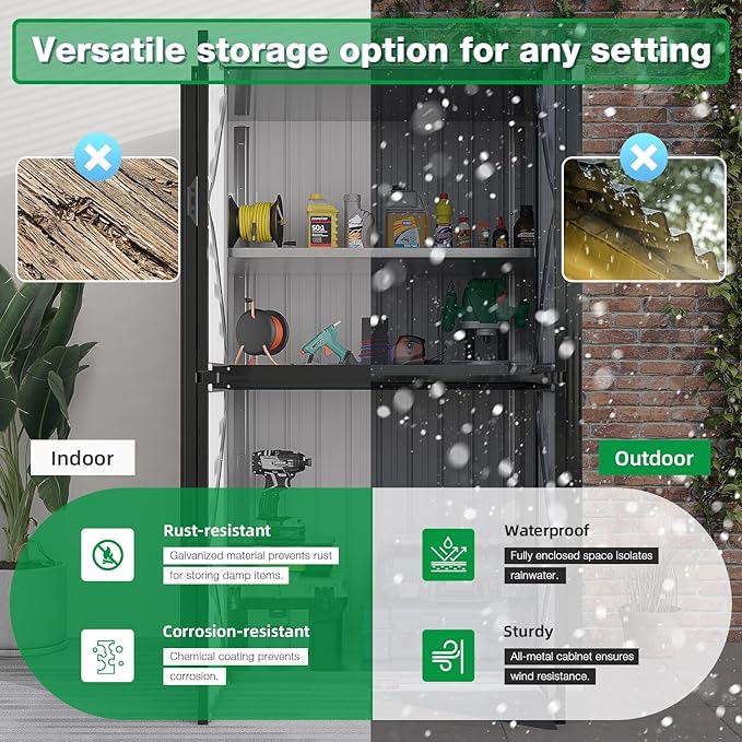 - Weatherproof Outdoor Cabinet: Fully sealed for outdoor storage waterproof protection and made from high-quality metal, weighing 95 lbs and capable of withstanding strong winds. It combines the benefits of traditional wooden and resin sheds, making it suitable for both indoor and outdoor use.
