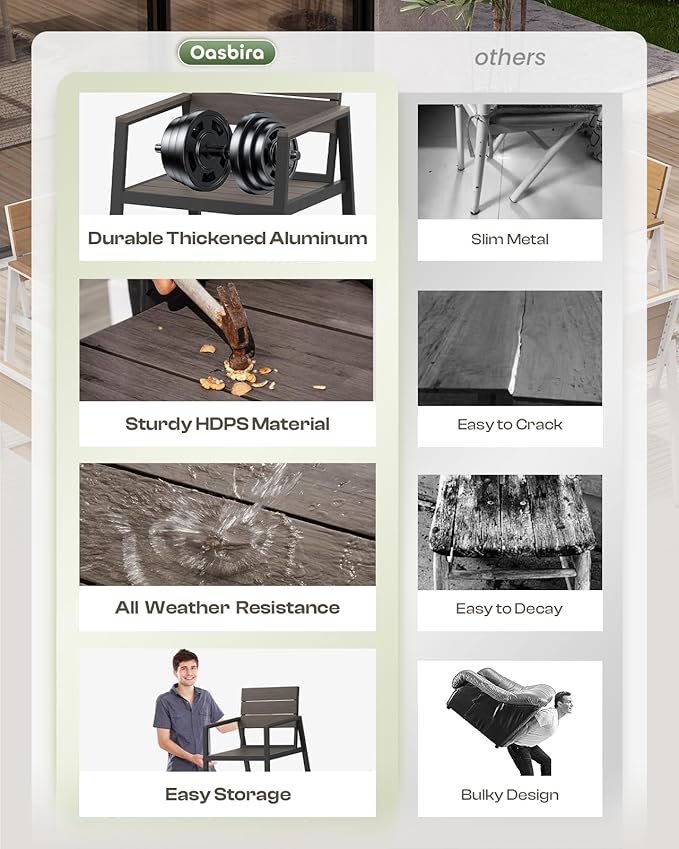 - Versatile & Low-Maintenance: The dining set is designed for indoor/outdoor versatility, this set transitions from patio, balcony, or garden to living rooms. Effortless cleaning β simply wipe surfaces with a dry microfiber cloth to remove dust and restore its polished wood-like finish. Letting you enjoy stylish comfort without demanding upkeep