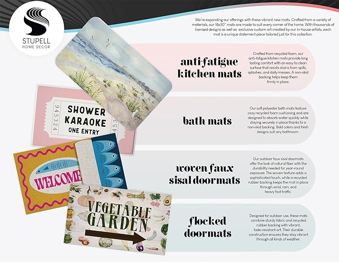 - Designed for outdoor use, these mats combine sturdy fabric and recycled rubber backing with vibrant, fade-resistant art. Their durable construction ensures they stay vibrant through all kinds of weather.