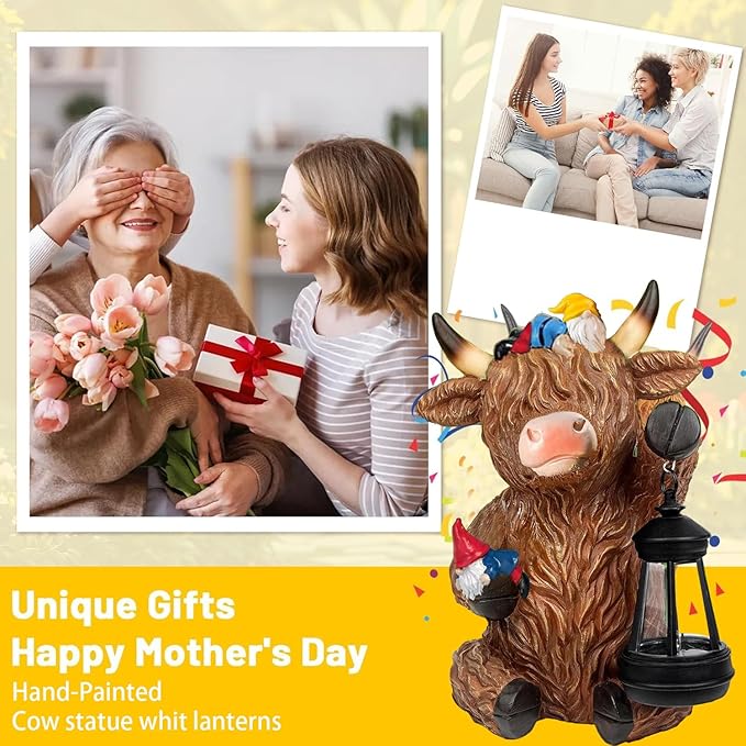 - Highland Cow Gnome Statue — This whimsical outdoor garden statues features one dwarf standing atop a cow's paw while another perches on the bull's head, accompanied by handheld lanterns symbolizing good fortune and light.Add charm and warmth to your garden with this perfect outdoor decoration.